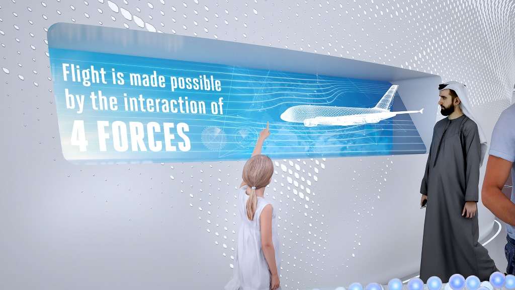 Animations using holographic models of futuristic aircraft will bring to life aeronautical science and explain how aircraft achieve flight by visualising the physical properties of lift, thrust, gravity and drag. Visitors will be able to interact with the scientific narrative to demonstrate how the combination of low air pressure and wing shape creates lift, which when fused with the other elements enables flight.