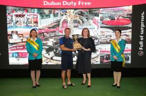 Home Mick Cairns wins 27th Dubai Duty Free Golf Cup Dubai Duty Free SVP for Marketing Sinead El Sibai presenting the trophy to Mick Cairns winner of the 27th Dubai Duty Free Golf Cup