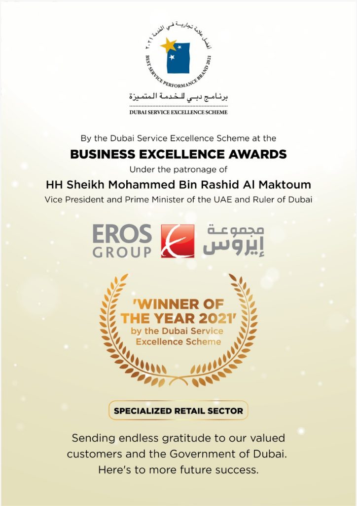The Dubai Service Excellence Scheme (DSES) awarded Eros Group in recognition of its excellence in customer service under its specialized retail sector. This is the third time the Group has received such an honorable award.