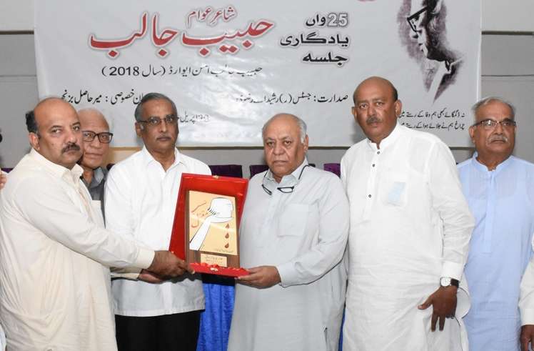 KARACHI: In the memory of 25th death anniversary of people’s poet, Arts Council of Pakistan Karachi hosted a session to honor the revolutionary poet Habib Jalib on Monday 30th April. Session was chaired by justice retired Rasheed. A. Rizvi. The minister of Maritime Affairs Mir Hasil Khan Bazinjo was the special guest for the occasion where many renown personalities like Muslim Shamim, Nasir Jalib, Dr. Jabbar Khatak, Faisal Edhi, Sajjad Zaheer, Ghulam Akbar, Ramzan Memon, Nasir Mansoor, Umar Baloch, Aqeel Abbas Jaffri, Sheikh Majeed and Karamat Ali were there to pay their tribute to the revolutionary one. Due to the magnificent struggles and efforts for restoration of democracy, comrade Jam Saqi was awarded with the Habib Jalib peace award 2018 later that evening.