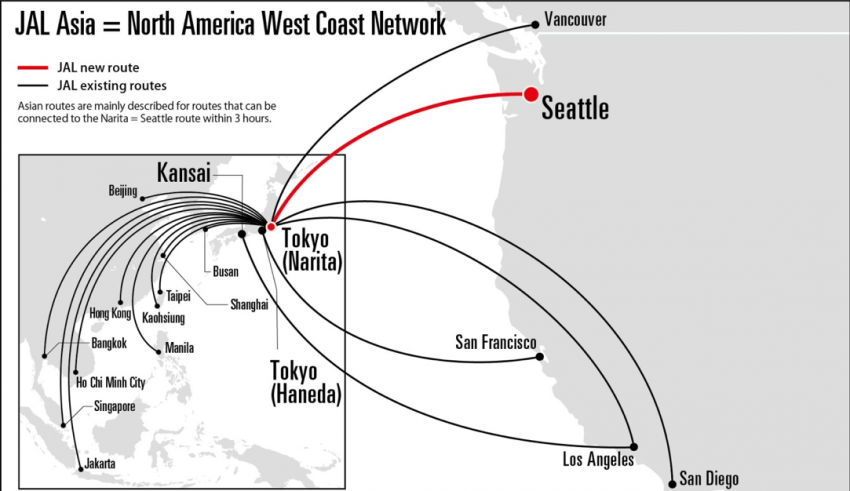 SEATTLE: Japan Airlines (JAL), together with its Pacific Joint Business partner American Airlines, today announced that the carrier will expand its trans-Pacific network with service between Narita International Airport (NRT) in Tokyo and Seattle-Tacoma International Airport (SEA), starting March 31, 2019*. This will be JAL’s sixth West Coast route operating between Japan and North America.