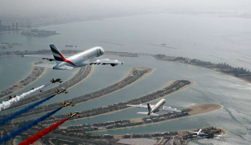 The spectacular flypast – a world-first and a UAE civil aviation milestone – involved over 11 aircraft: a flydubai Boeing 737 MAX 8 (Zayed 1), an Air Arabia Airbus A320 (Zayed 2), an Etihad Airways Airbus A380 (Zayed 3) and an Emirates Airline Airbus A380 (Zayed 4), as well as seven Al Fursan aerobatic display jets from the UAE Air Force. All of the commercial aircraft within the formation were emblazoned with ‘Year of Zayed’ decals. This is also the first time this unique combination of aircraft types fly in formation.