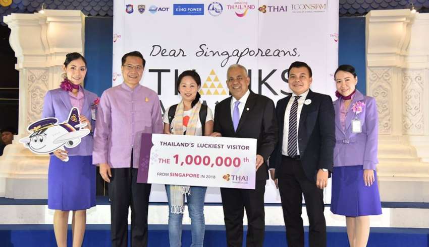 Mr. Weerasak Kowsurat, Minister of Tourism and Sports, welcomed Ms. Angela Sui Hoon Kwek, the 1,000,000th Singaporean Visitor to Thailand in 2018. At the event, Mr. Siriphong Mangkalee, THAI Director, ASEAN Department, presented two roundtrip business class tickets on the route Singapore-Bangkok-Chiang Mai to the 1,000,000th Singaporean Visitor. Also present were Mr. Nivat Chantarachoti, THAI General Manager, Singapore, representatives from TAT, as well as those from the public and private sectors and state enterprises. News Desk