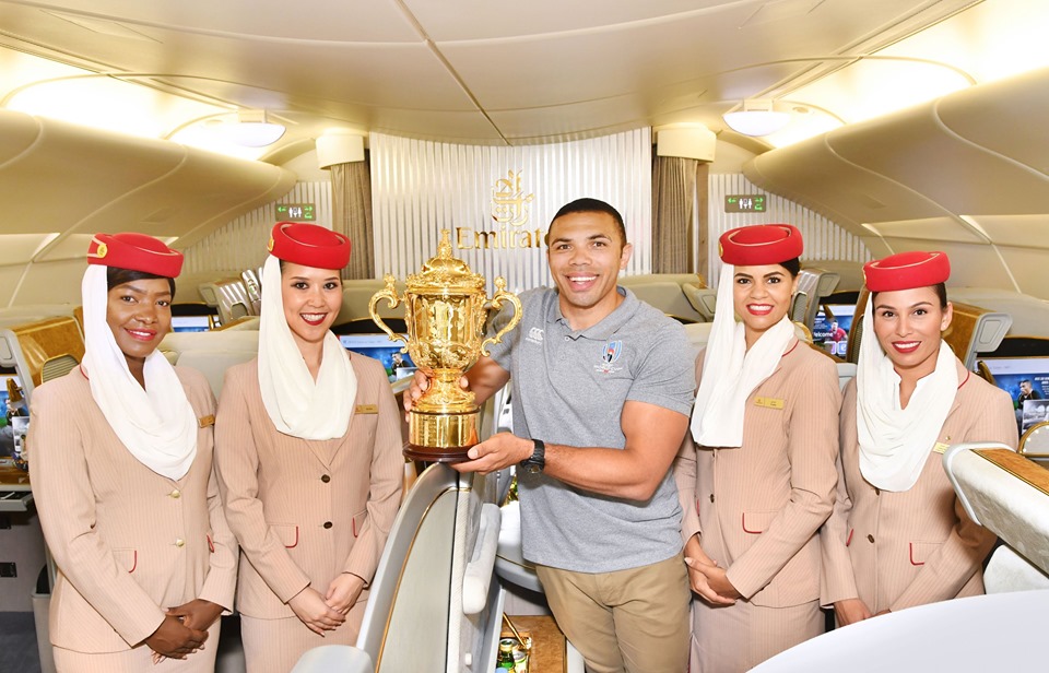 Bryan Habana on board Emirates flight EK 318 with the Webb Ellis Cup on its way to Japan