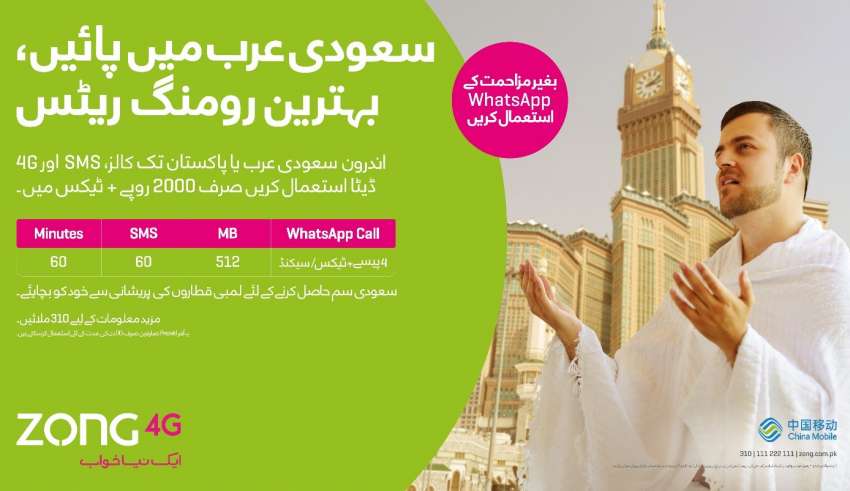 ISLAMABAD: In its commitment to offer convenience to Pakistani travelers, and in particular customers headed to Saudi Arabia for Hajj, Zong 4G, Pakistan’s leading telecom company has introduced an exclusive prepaid roaming bundle for Saudi Arabia.  The bundle offers exciting opportunities for Zong 4G’s customers to communicate with friends and family while being abroad and particularly during Hajj.