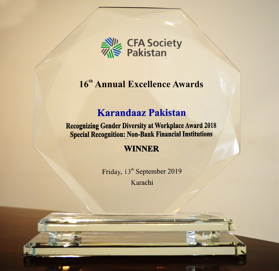 KARACHI: Karandaaz Pakistan won the prestigious CFA Society Pakistan’s award for “Recognizing Gender Diversity at Workplace 2018”. The award ceremony is CFA Society Pakistan’s flagship event for the year and celebrates industry leaders with outstanding performance under various categories that have provided value-enhancing services to the financial industry and investing public in Pakistan. Farwa Hasnain, Company Secretary and Head of Human Resources at Karandaaz Pakistan received the award from Dr. Reza Baqir, Governor State Bank of Pakistan at the 16th Annual Excellence Awards Ceremony of CFA Society Pakistan held in Karachi.