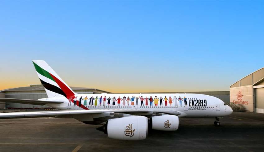 The vibrant ‘Year of Tolerance’ livery depicts a panorama of people from diverse backgrounds and cultures holding hands in solidarity, celebrating the UAE’s message of multiculturalism. The colourful illustrations adorn both sides of the aircraft. After its debut this Friday, this aircraft will fly across Emirates’ A380 network of over 50 destinations for the next twelve months to spread messages of tolerance and mutual respect wherever it lands.