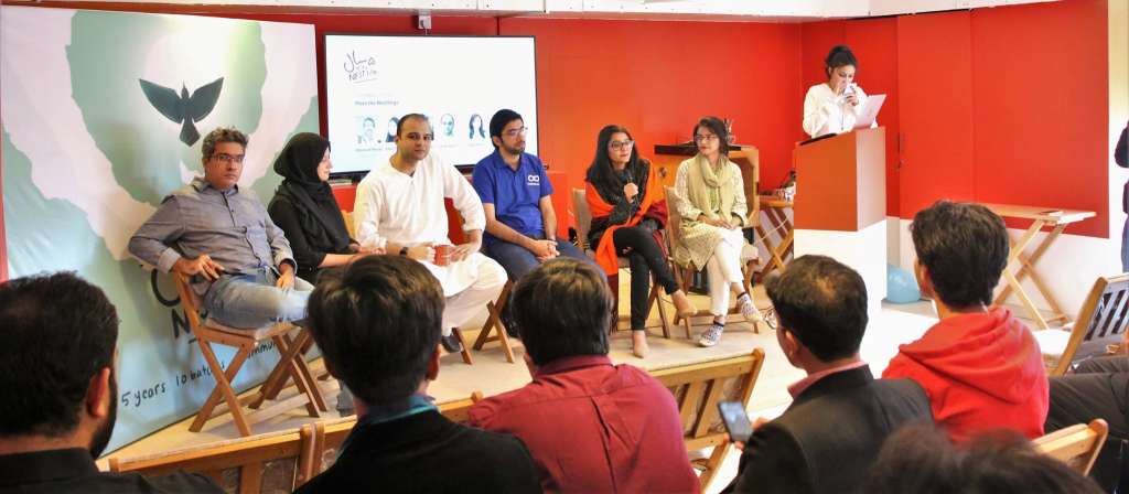 The first panel of the day was “Working Together: Shared Spaces for a Shared Future” comprised representatives of JoyCo, WorkHall, T2F, and Karachi Biennale. The panel was moderated by Khizra Munir, who founded CO Pakistan and focused on the importance of open spaces and events for emotional and intellectual growth of the society.