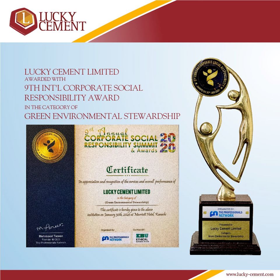 KARACHI: Lucky Cement Limited (psx: LUCK) won the Int’l Corporate Social Responsibility Award in the category of “Green Environmental Stewardship”, organized by The Professionals Network (TPN), at the 9th CSR Summit & Awards held on 30th January, 2020 at Marriott hotel, Karachi.