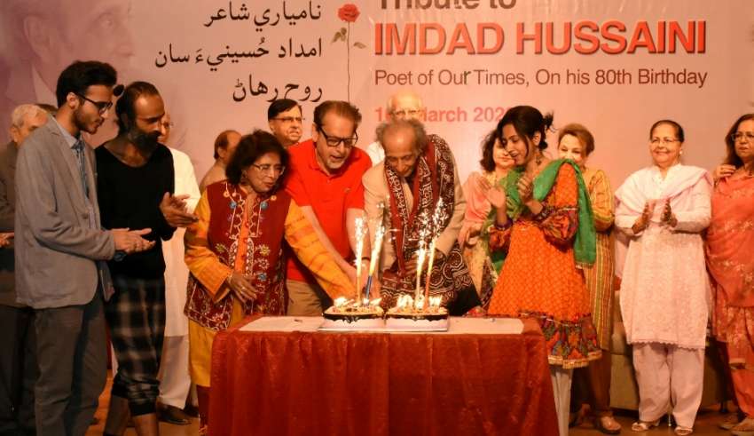 Paying tribute to Imdad Hussaini speakers said that Imdad Hussaini is a great name in the world of literature; His poetry includes romance and the pain of loving his land. On the occasion of Imdad Hussaini’s birthday his book “Imdad Aahe Roll” was launched and his birthday cake was also cut.