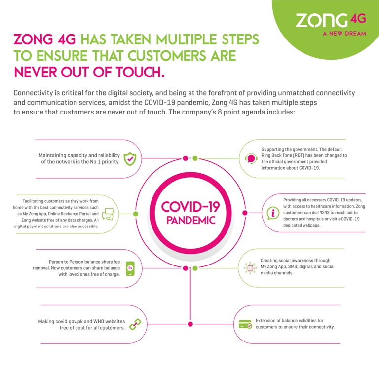 ISLAMABAD: In response to coronavirus outbreak, Zong 4G has announced a comprehensive plan to maintain network services, assist government authorities, facilitate customers and ensure that the economy continues functioning digitally. The plan has been designed to ensure that during this crisis, Zong 4G continues providing uninterrupted services, as connectivity is key for both customers and businesses. As a responsible corporate entity, Zong 4G has also initiated a country-wide awareness drive across all channels.