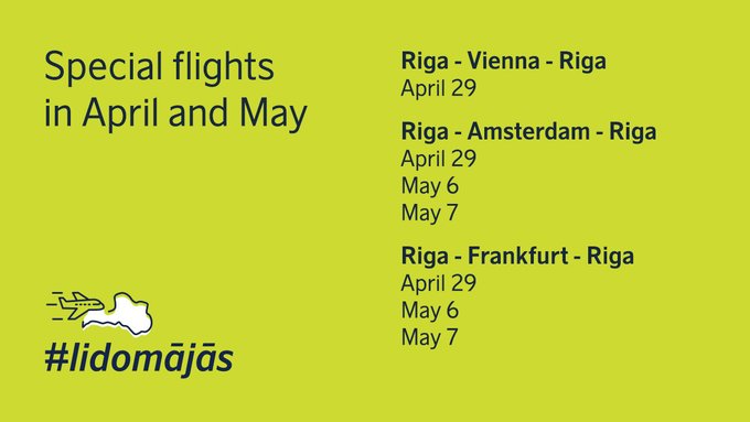 RIGA: After a request from Ministry of Foreign Affairs of the Republic of Latvia and with permit from the Ministry of Transport, Latvian airline airBaltic has scheduled additional special flights from Vienna, Frankfurt and Amsterdam to Riga and vice versa. These flights one way will be able to transport up to 140 passengers.