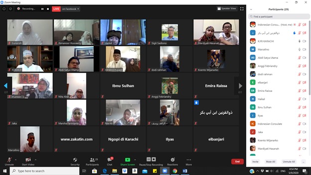 Like the Indonesian people in their native homeland, Indonesian Consulate General in Karachi also held “Ngabuburit” programme for Indonesian nationals in Sindh Province, Pakistan amidst the current Covid-19 pandemic situation since the first day of Ramadan, Saturday (26/4). Following the social and physical distancing #stayathome, this activity is packaged in a virtual meeting through the Zoom Application and live on Official Facebook Page of the Indonesian Consulate General where the speakers deliver lectures on Islamic studies “NGOPI – NgobrolPerkaraIman” or virtual dialogue on articles of Islamic Faith, Virtues of Ramadan, and other topics related to Islam before breaking the fast in Ramadan.