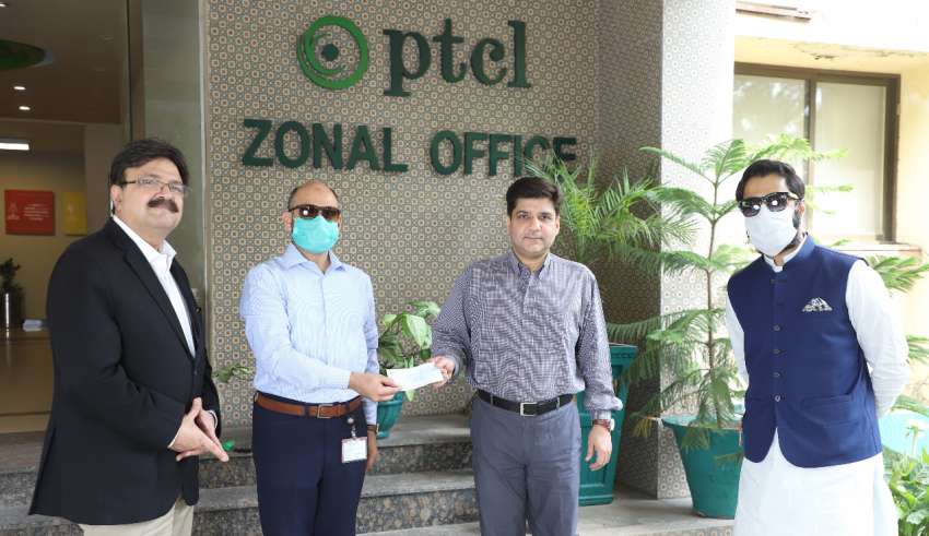 Nadeem Nazir, GM HR, PTCL is presenting cheque to Nadeem Hashmi, Marketing Head, Shaukat Khanum Research Center, along with Akram Zubair, GM Admin & Security, PTCL and Zeeshan Sarwar, Head of Corporate Collaboration, Shaukat Khanum Research Center. PR