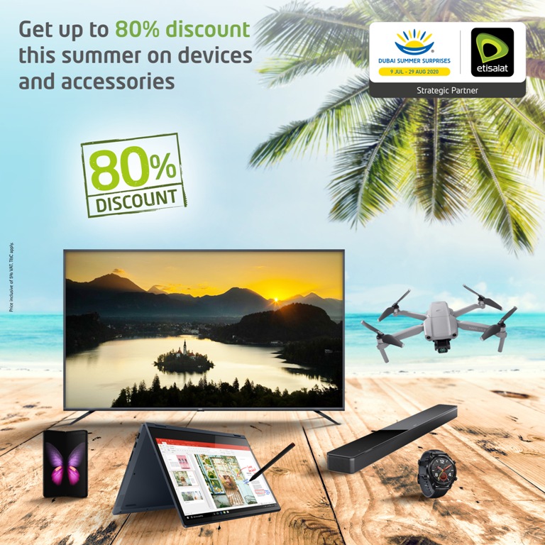 As a strategic partner, Etisalat is offering up to 80% discount on smartphones, TVs, accessories and gadgets of various brands such as Huawei, Samsung and DJI with Smartpay options of up to 24 months and free delivery for online orders. Purchases of these devices could be made via the website www.etisalat.ae, My UAE Etisalat app, eWallet app, and Etisalat retail stores across the UAE from 9 July to 29 August 2020. Customers get up to AED100 cashback for purchases using the eWallet app.