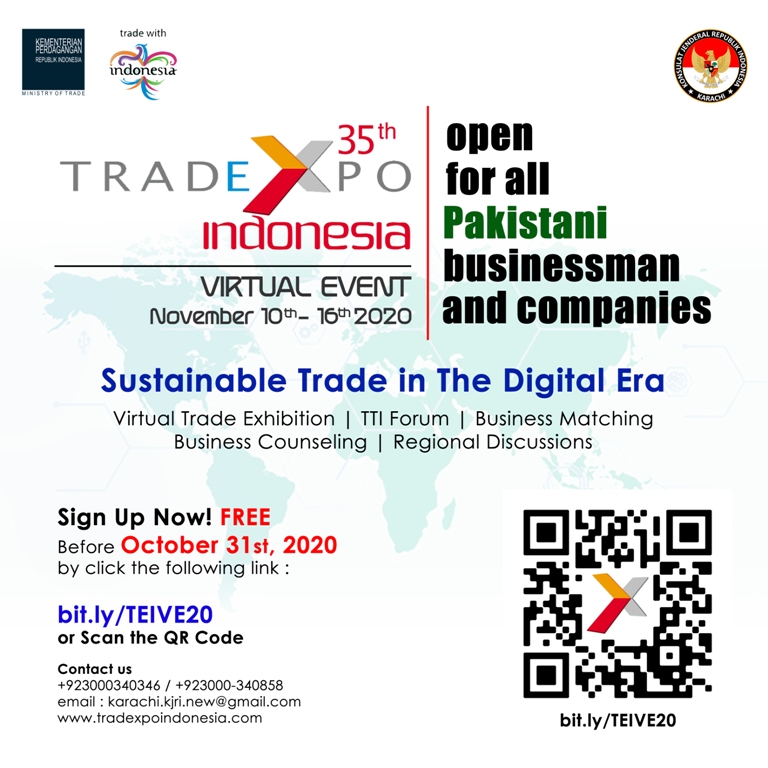 The Consulate General of the Republic of Indonesia in Karachi, invites all members of Pakistan-based Chamber of Commerce, Associations, as well as private business communities to participate in TEI-VE 2020 by scanning the QR code below, visiting this link, or fill out the offline form attached. bit.ly/TEIVE20