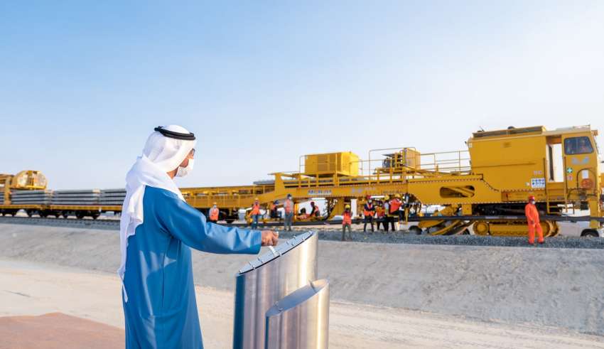 ABU DHABI: His Highness Sheikh Hamdan bin Zayed Al Nahyan, the Ruler’s Representative in Al Dhafra Region, inaugurated track-laying works across Al Dhafrah Region in Package A of Stage Two of the UAE’s national railway, during his visit to Etihad Rail’s railhead in Al Ruwais.