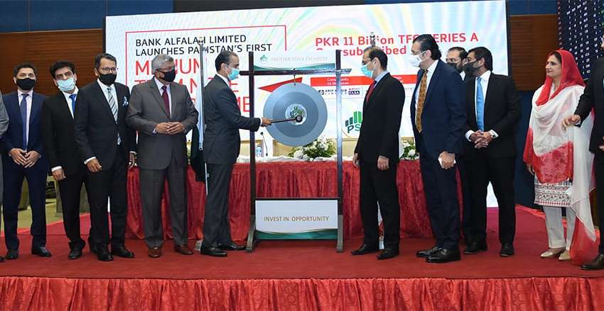 In a very encouraging development for the debt market of Pakistan, an innovative, new debt instrument has been issued and listed on Pakistan Stock Exchange (PSX) by Bank Alfalah (BAFL). Bank Alfalah has issued Medium Term Note in the form of Term Finance Certificates (Tranche Series-A) of PKR 11,000 million through Shelf Registration Program, which have been listed on the Exchange as of today, January 28, 2021. A Gong Ceremony was held at Pakistan Stock Exchange to mark the listing of the instrument.The gong was struck by the CEO of Bank Alfalah, Mr. Atif Bajwa, amidst the presence of the Members of the PSX Board, the MD & CEO of PSX, Mr. Farrukh H. Khan, and senior management of PSX, SECP and BAFL. Also present at the occasion were the senior management and representatives of Arif Habib Limited& Alfalah CLSA Securities, Joint Lead Managers& Arrangers to the Issue.