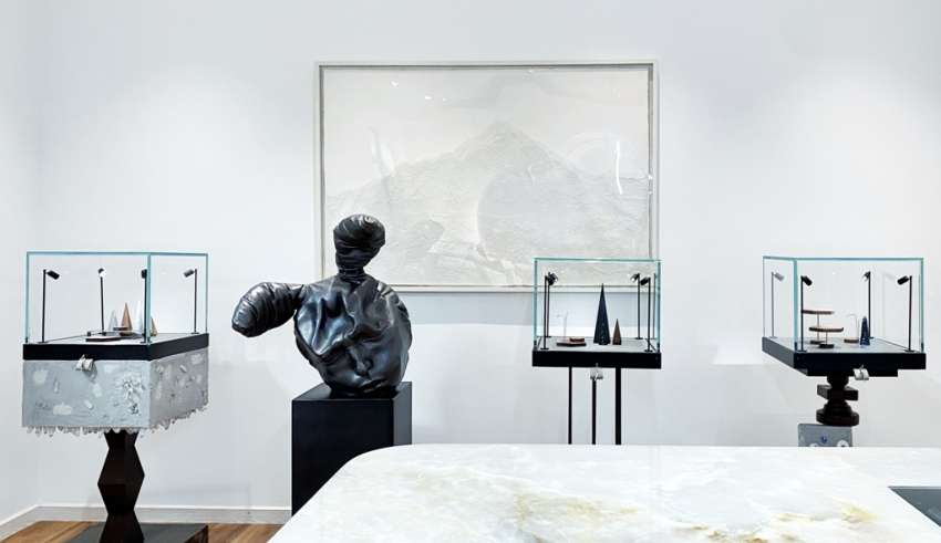 Lama designed her display cabinets and furniture pieces around her jewelry’s core elements; unique forms, timeless lines and playful approach to design, depicted in a pink accent wall, asymmetric display cabinets and a vibrant facade.
