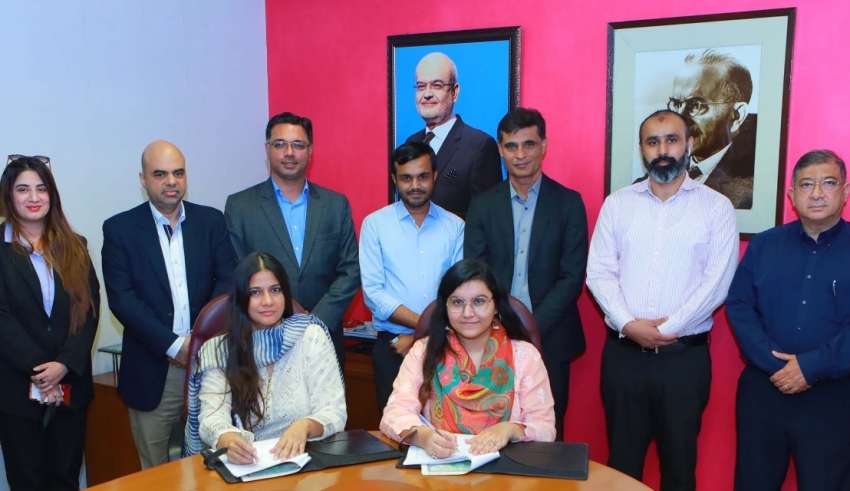Ms Anum Jawed Akhai, Group Director Business Growth & Strategy Martin Dow and Sadaf Mahmood, Chief Operating Officer Nutshell Communications sign the agreement for their respective organization.