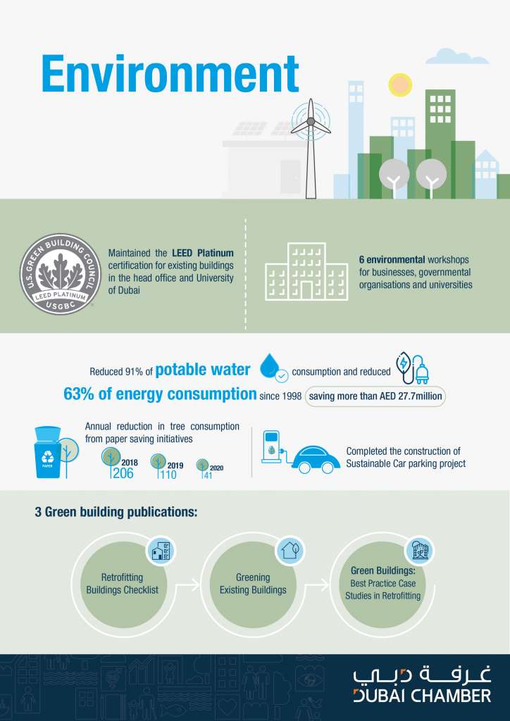 In 2020, the Chamber maintained LEED Platinum certification for its head office and the University of Dubai campus. It hosted 6 environmental workshops for businesses, governmental organisations and universities.