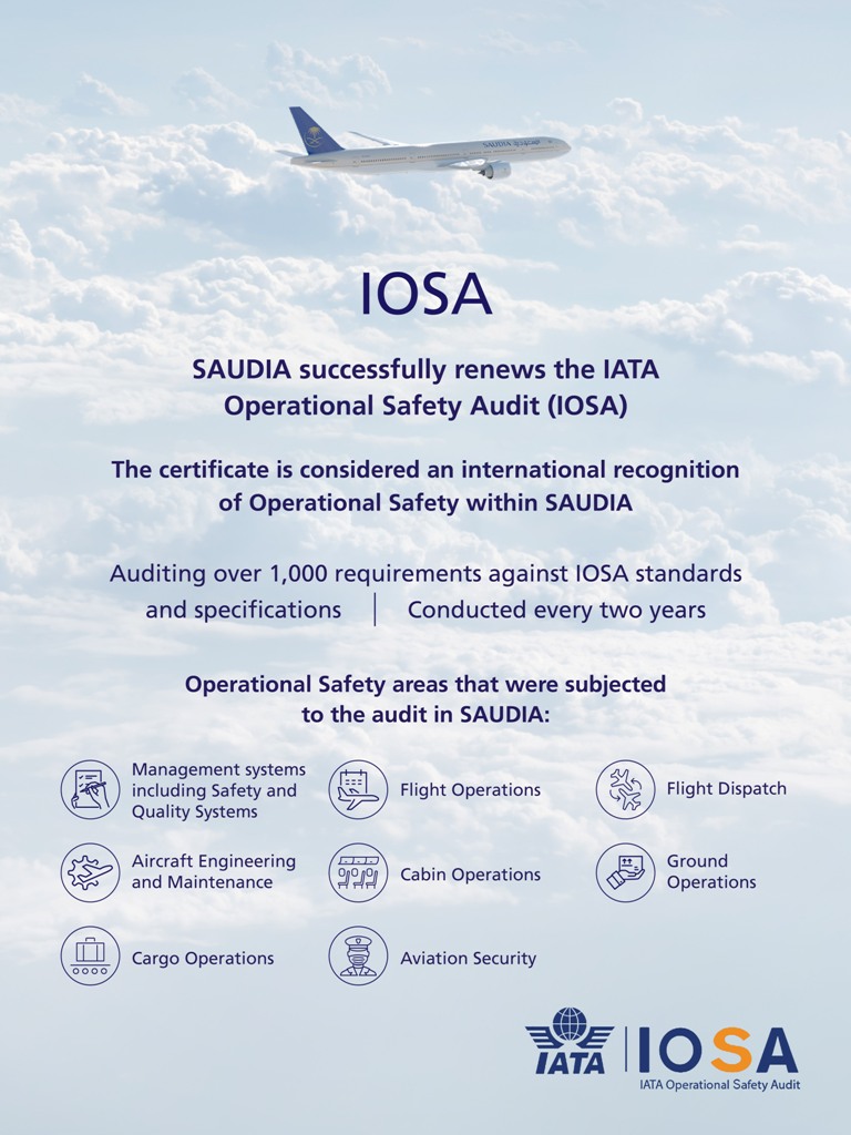 SAUDIA is one of the first airlines to be audited by IOSA since the establishment of the airline audit program in 2003. The IOSA certification is granted by IATA to airlines that meet a number of approved safety and operational quality standards. This certificate has become a prerequisite for IATA membership, which highlights the importance of this recognition for SAUDIA.