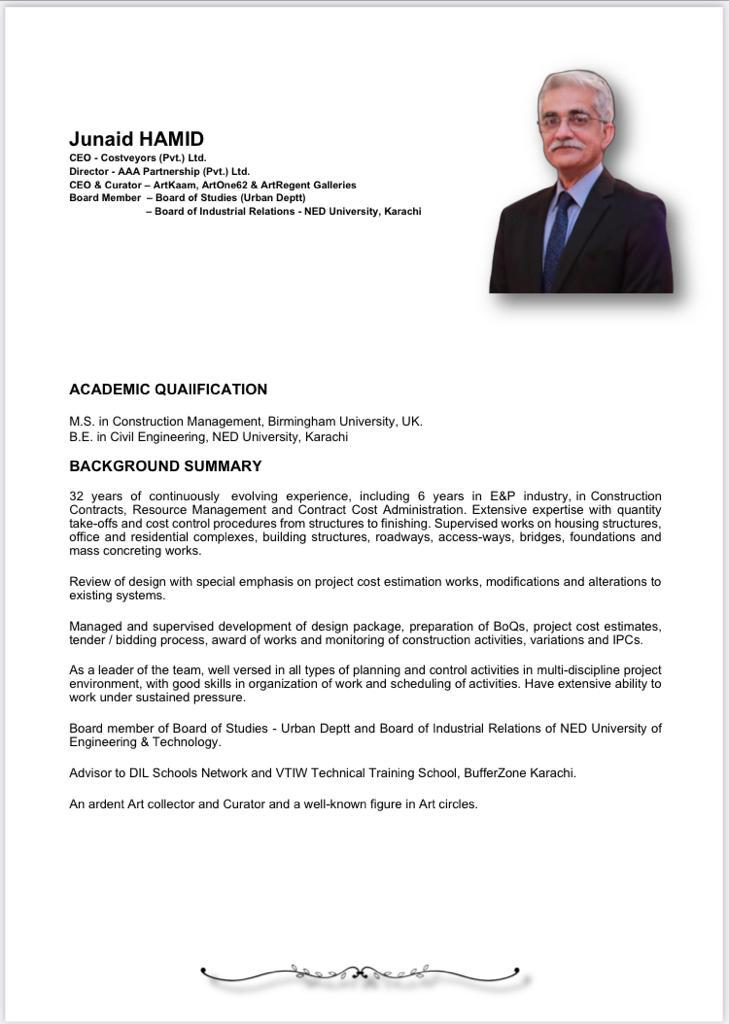 He has 32 years of continuously evolving experience, including 6 years in the E&P Industry in Construction contracts, Resources Management, and Contract Cost Administration. Extensive expertise with quantity take-offs and cost control procedures from structures to finishing. He has supervised works on housing structures, offices, and residential complexes, building structures, roadways, access-ways, bridges, foundations, and mass concreting works. Junaid Hamid did in B.E. in Civil Engineering from NED University, Karachi, and M.S. in Construction Management from Birmingham University, UK.