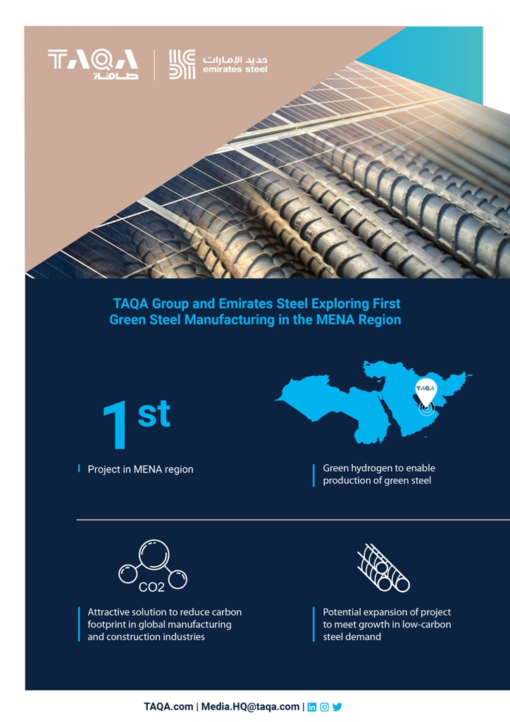 Abu Dhabi National Energy Company PJSC (“TAQA”), one of the largest listed integrated utilities in the region, announced today a partnership with Emirates Steel, the leading integrated steel plant in the Middle East, to develop a large-scale green hydrogen project enabling the first green steel produced in the MENA region.