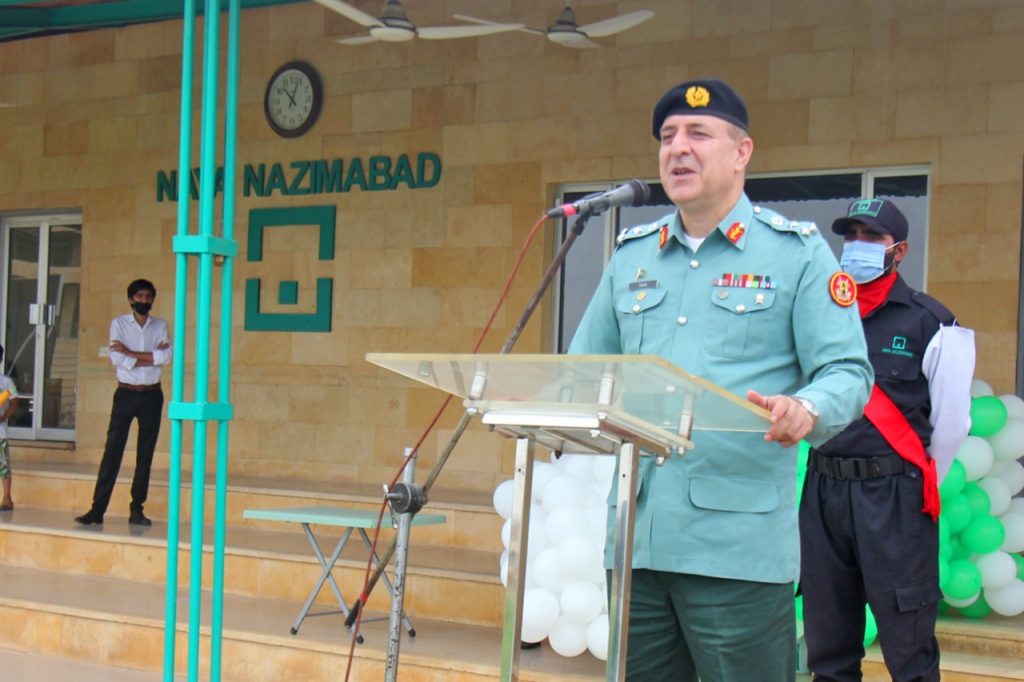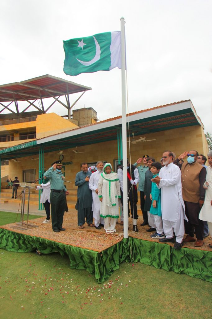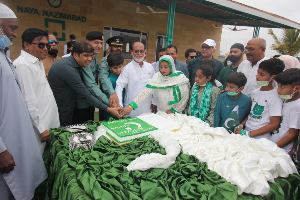 Pakistan’s National Flag was hoisted by Chief Executive Officer (CEO) Naya Nazimabad Abdus Samad Habib, President NFEH Naeem Qureshi, Pakistan Rangers’ Brigadier Tahir Ayaz, President Naya Nazimabad Gymkhana S.M. Talha and CEO Naya Nazimabad Maintenance Company Saeed Ahmed, Anees Younus President CSR Club.