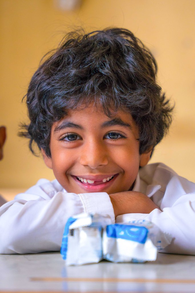 Hussien, 6 years old in the classroom with his classmates after receiving their daily share of WFP’s nutritious snacks at WFP supported school in Zinjibar, Abyan, Yemen WFP’s school feeding programme supports 1.55 million children in schools across Yemen with daily nutritious snacks. The programme helps increase enrolment in school, boosts daily attendance and encourages children to remain in school. WFP targets areas where enrolment in school is low, the area has adversely affected by conflict and where food security indicators are also low. WFP provides fortified date bars and/or high energy biscuits as a midday snack to children in school so that they are able to continue concentrating in school. For many children this snack represents a core nutrition boost to their diet. An estimated 2 million children in Yemen are out of school and over 1,800 schools have been directly affected by the conflict. One in five schools across the country cannot be used because they have either been destroyed or damaged, or are sheltering displaced families, or being used for military purposes.