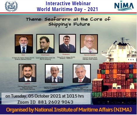 National Institute of Maritime Affairs (NIMA) organized a webinar to celebrate “World Maritime Day” on 5th October 2021. The theme of this year’s set by the International Maritime Organization (IMO) is “Seafarers: at the Core of Shipping’s Future”. IMO has chosen this theme to make 2021 a year of action for seafarers. Purpose of this webinar to raise awareness about the important role that seafarers play in sustaining global shipping and providing livelihood to the world community. They face unprecedented hardships of sea life and various other hurdles, particularly due to the recent COVID-19 pandemic.