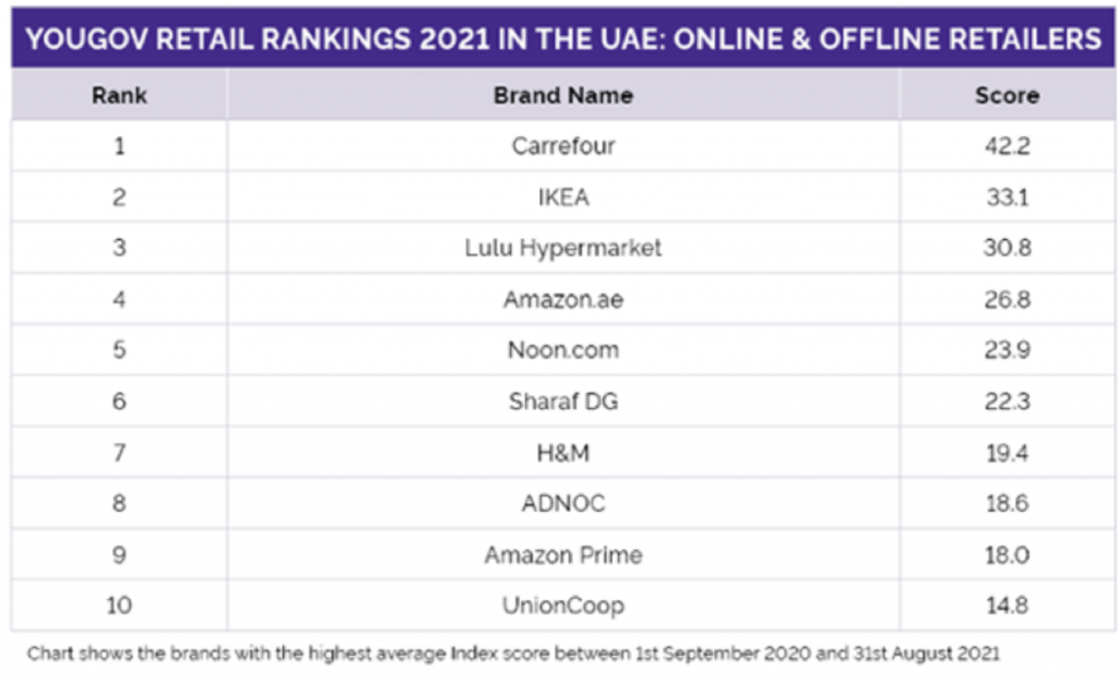 Carrefour has been ranked number one with a score of 42.2 in the YouGov Retail Rankings 2021 UAE, almost 10 points ahead of its closest competitors in second and third place.