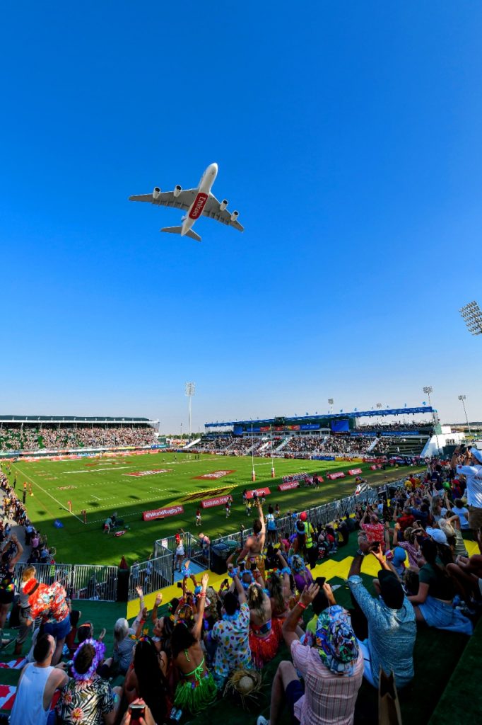 Thousands of rugby fans were treated with a low-level flypast above The Sevens Stadium with the Emirates A380, emblazoned with the unique ‘United Arab Emirates 50’ design on both sides of the aircraft marking the Golden anniversary of the UAE.