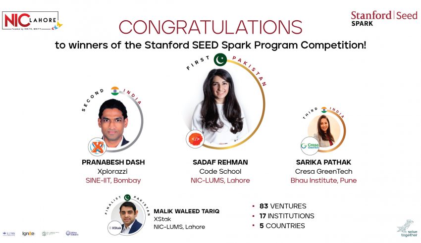 National Incubation Center (NIC) Lahore at LUMS nominated start-up Codeschool.pk has won top laurels and a cash prize in the capstone business pitch competition in the Stanford Seed Spark Program for high-achieving entrepreneurs across South Asia. This was the inaugural cohort from Pakistan, and was introduced by NIC LUMS.