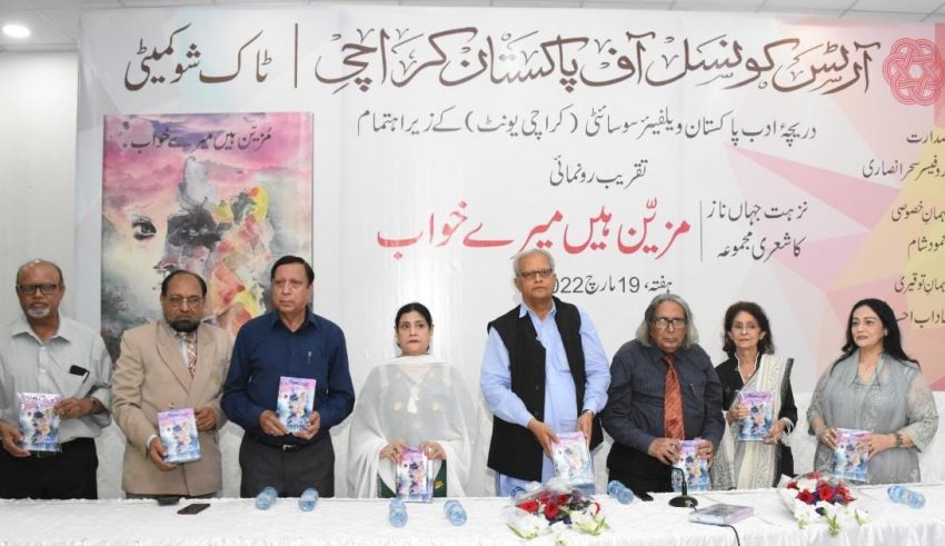 Arts Council of Pakistan Karachi Talk Show Committee and Daricha Adab Pakistan Welfare Society (Karachi Unit) organized the launch of Nazhat Jahan Naz’s poetry collection ” Muzayen Hein Meray Khuwab ” at Hasina Moin Hall which was presided over by Prof. Sehar Ansari & The special guest was Prof. Shadab Ehsani and the guest of honor was Farasat Rizvi.