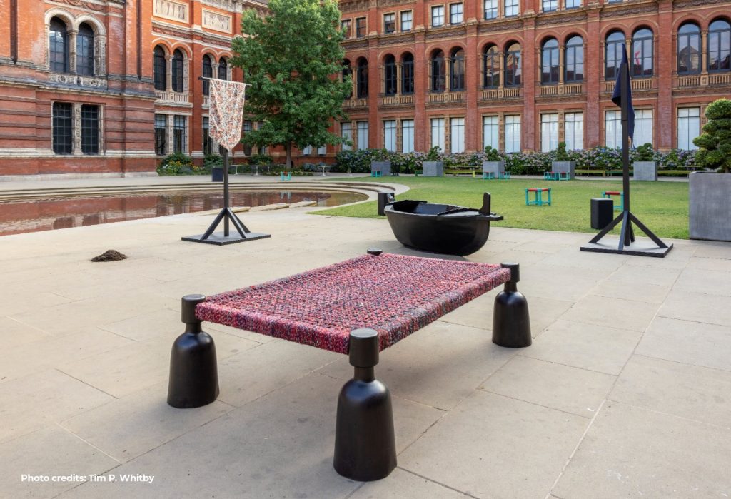 For the final intervention, the John Madejeski Garden will be transformed into a space for communal contemplation, with a number of colourful charpai and mora stools, designed to be used, moved and enjoyed by visitors, reflecting themes of displacement. Each charpai (a ubiquitous day bed found across South Asia) is handmade using different weaving techniques to celebrate the diversity of the textile heritage of Pakistan. Finally, at the centre of the Garden installation, visitors will encounter a wooden vessel, typically found in the mangroves of coastal Pakistan. Moored off water, the vessel symbolises the precarity of water-dependent communities and the erosion of natural environments at this moment of global climate crisis as well as colonial histories of exploitation.