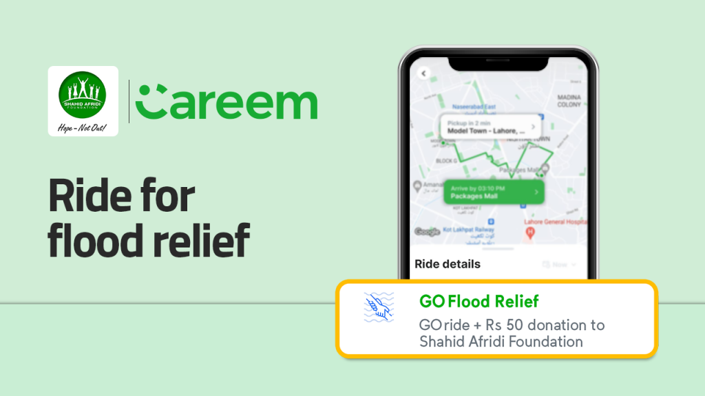 As Pakistan faces catastrophic flooding, due to unprecedented rainfall in many areas of the country, Careem has joined hands with Shahid Afridi Foundation (SAF) to launch a donation car ride called GO Flood Relief for its customers. The initiative will enable customers to donate an amount of PKR 50/- for every ride taken.