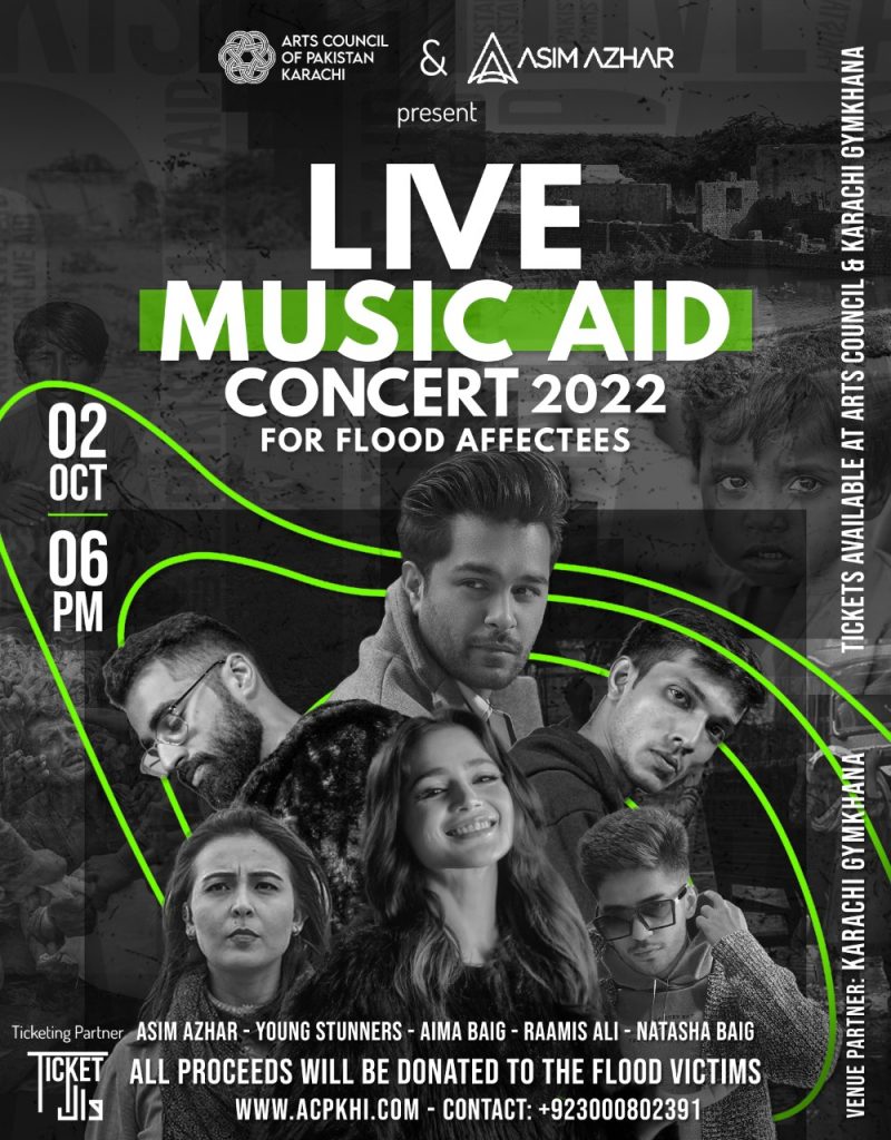 Arts Council of Pakistan Karachi has announced the “Live Music Aid Concert 2022” to help the flood victims, in which Asim Azhar, Young Stunners, Aima Baig, Natasha Baig Raamis Ali, and other famous singers of the country will awaken the magic of their voice.