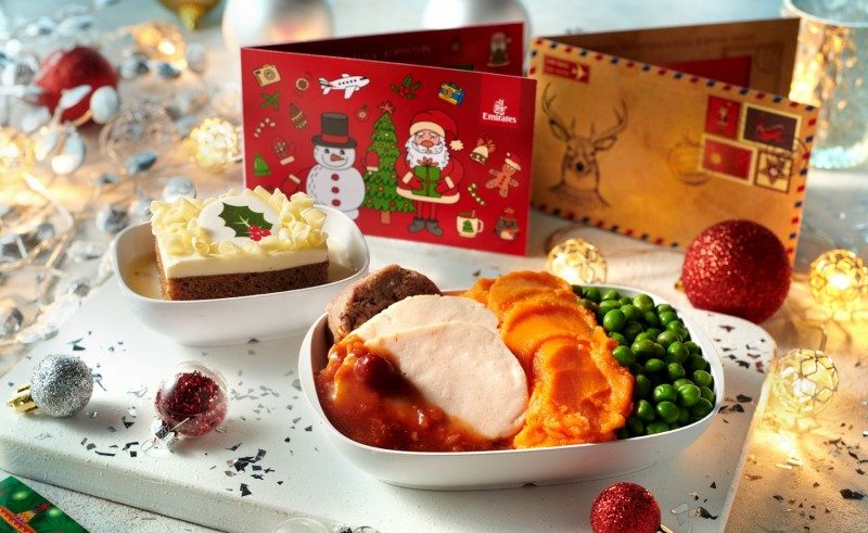 For the entire month of December, ’tis the season to be jolly onboard Emirates with festive meals and snacks in all cabins on select routes, with green and red Christmas lights aglow. First and Business Class passengers can indulge in all the classic Christmas dishes, from lemon and herb marinated king prawns with fennel salad and marie rose sauce, to cured salmon gravadlax with mustard crème fraiche to start, also enjoyed in Premium Economy Class. A full festive main course with all the trimmings will be available in all three classes– roasted turkey with cranberry compote, chestnut stuffing, pumpkin with honey and thyme, potato wedges and crunchy brussels sprouts peppered with turkey bacon. Desserts include a variety of delectable dishes – Christmas pudding with a generous dollop of crème anglaise, festive ginger cake smothered in dark chocolate ganache, or a vibrant redcurrant chocolate mousse cake in the shape of Santa. Economy Class passengers will also have a moreish Christmas meal featuring roasted turkey with chestnut roulade, pommes Parisienne, a medley of parsnip, carrots, and green peas, followed by a sumptuous gingerbread cake doused with cream cheese frosting and cinnamon sauce.