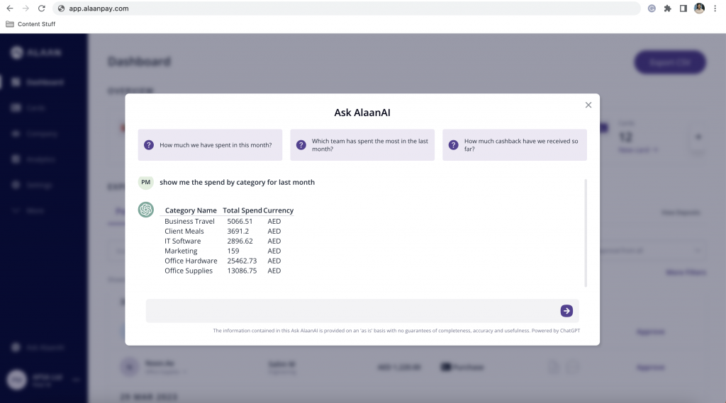 Alaan is committed to providing the best possible experience for its corporate users, and the integration with OpenAI will help achieve this goal. With its powerful AI capabilities, Alaan will be able to deliver a faster, more accurate, and more streamlined expense management experience that saves time, reduces errors, and helps businesses stay on top of their finances.