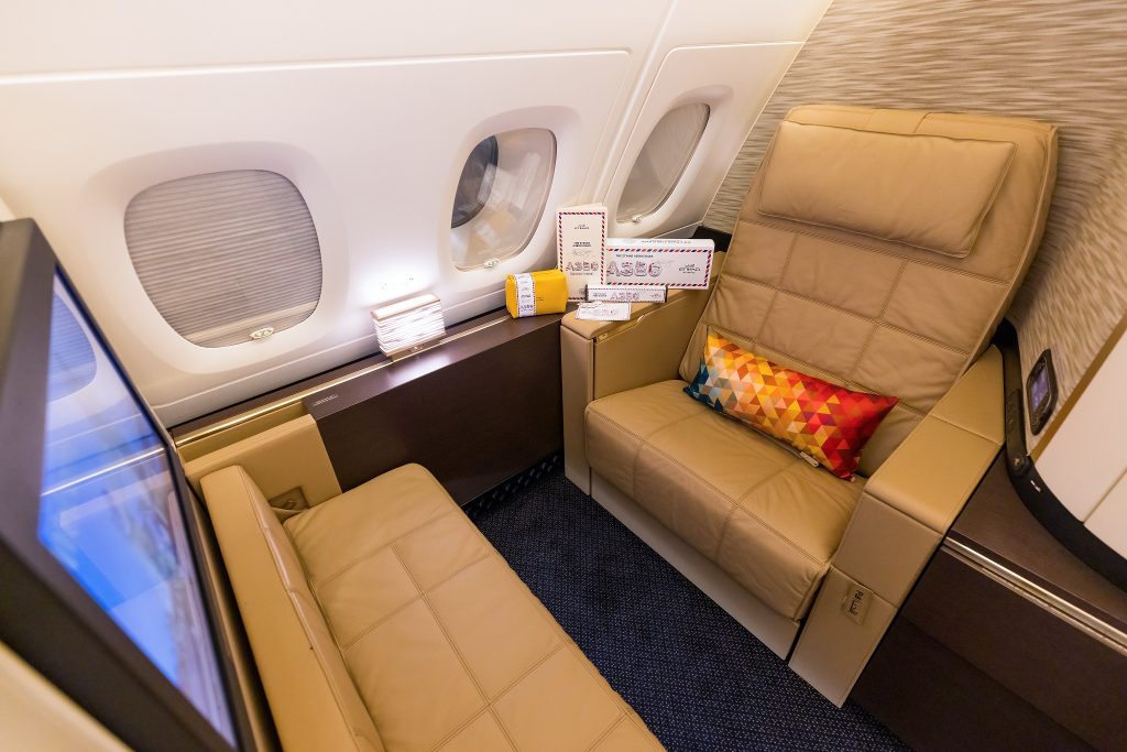 Guests can choose from nine First Apartments featuring a private living space with exquisite amenities and designer tableware, a wide leather lounge chair and a separate ottoman which converts into an 80″ lie-flat bed. First class guests can freshen up in the comfort of the Apartment with personal vanity units, as well as take advantage of the First class shower room.