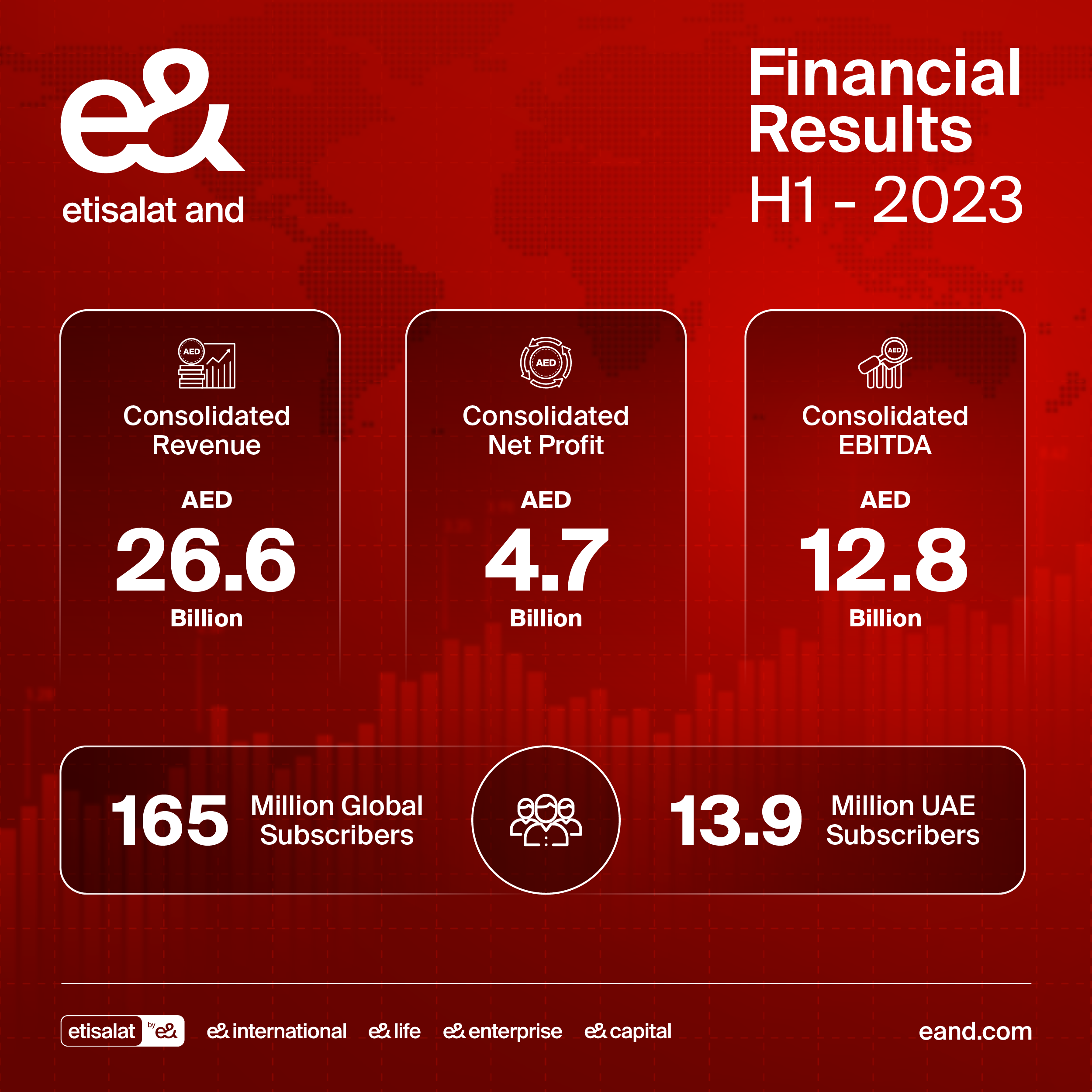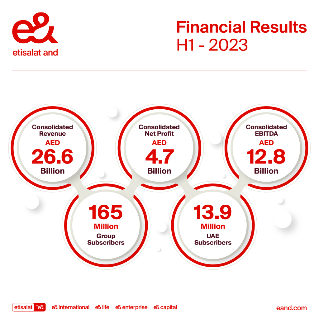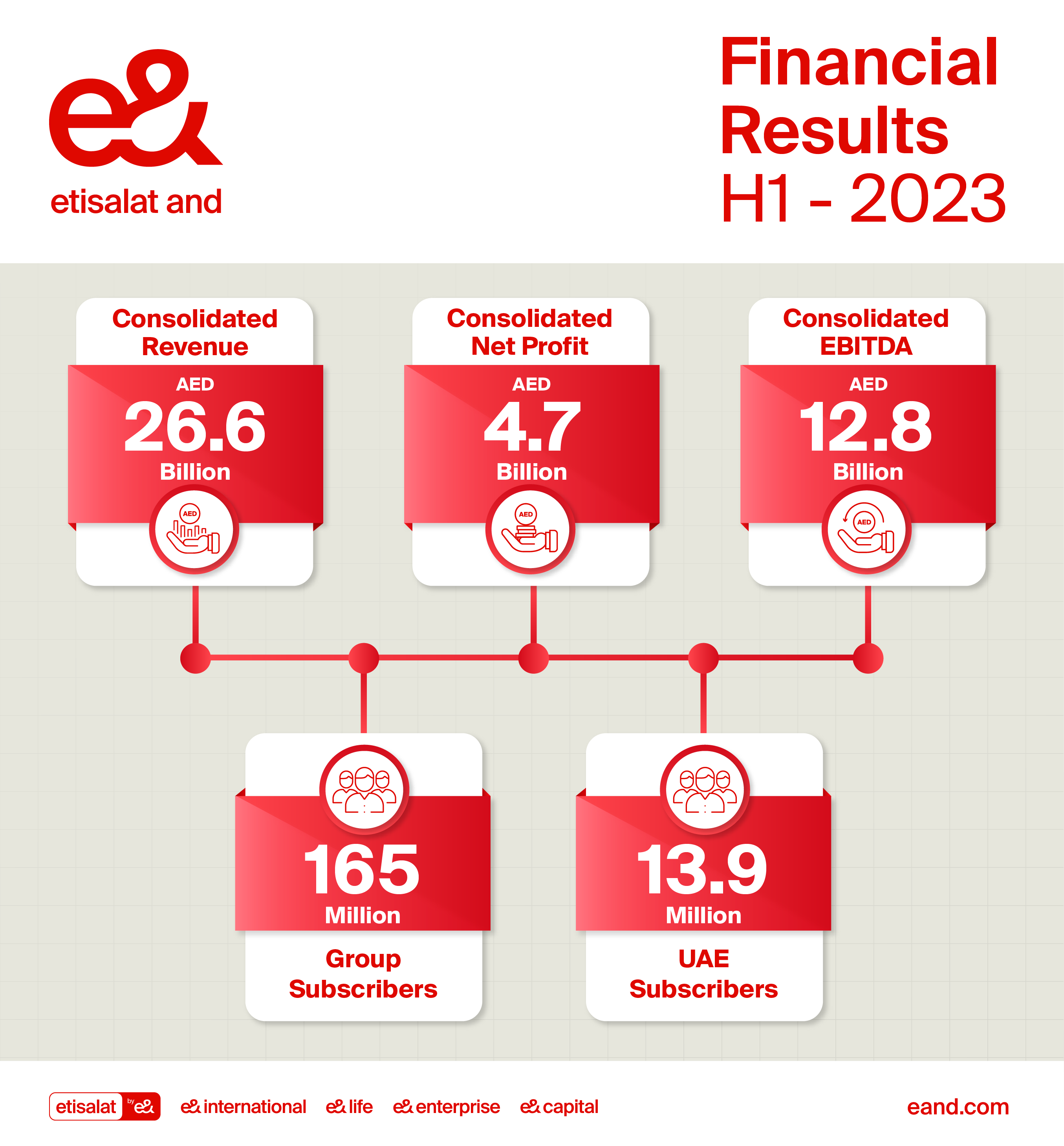 e&’s consolidated revenues during the H1 2023 reached AED 26.6 billion a YoY increase of 1.1 per cent. Consolidated net profit recorded AED 4.7 billion while consolidated EBITDA reached AED 12.8 billion, resulting in an EBITDA margin of 48 per cent.