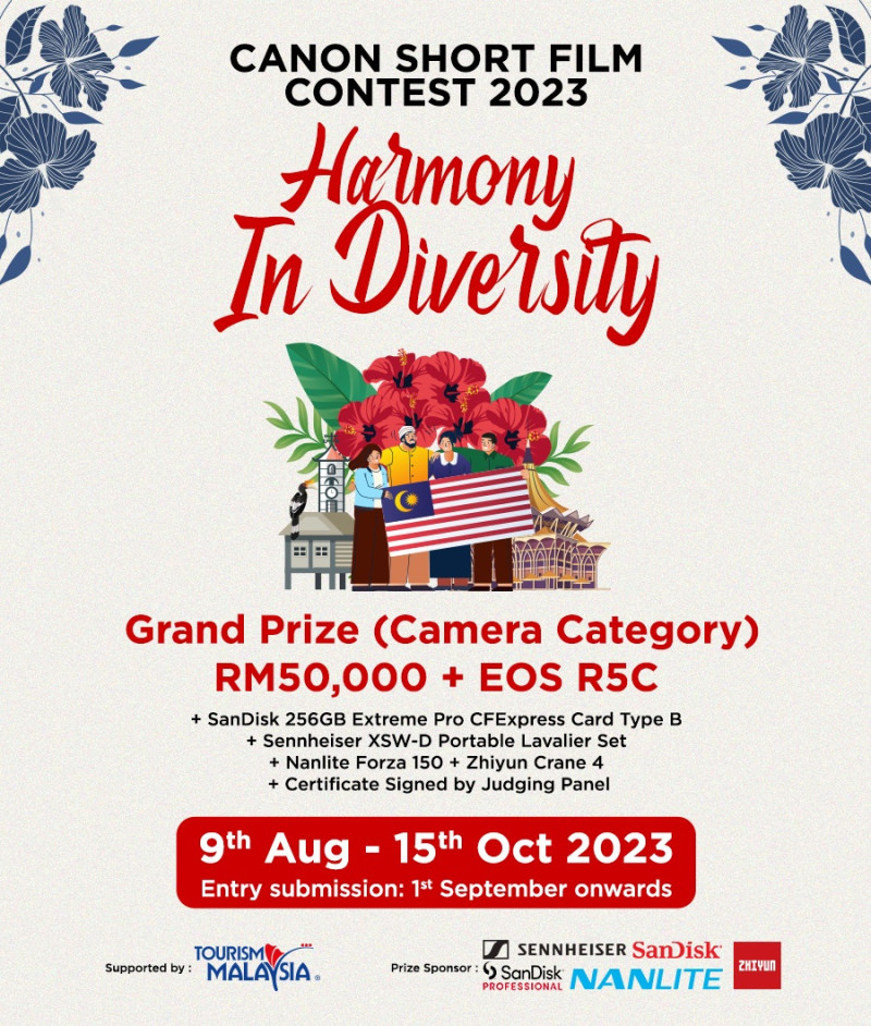 Themed “Harmony in Diversity,” the Canon Short Film Contest 2023 invites participants to embark on a narrative journey in appreciation of the rich tapestry of cultures that surrounds us. The contest casts a spotlight on captivating short films that showcase the exceptional experiences that Malaysia has to offer such as culture, racial diversity and travel destinations; while serving as a compelling medium that highlights the flair for storytelling held by our local filmmakers.