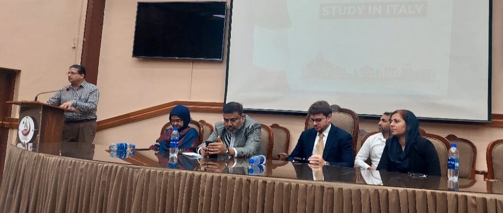 Dean Faculty of Arts, University of Karachi in collaboration with the Consulate of Italy organized a seminar on “Italy as a destination of Academic Research and Higher Education.” The purpose of the seminar was to introduce the students of University of Karachi and the faculty members about the University portal UniversItaly.