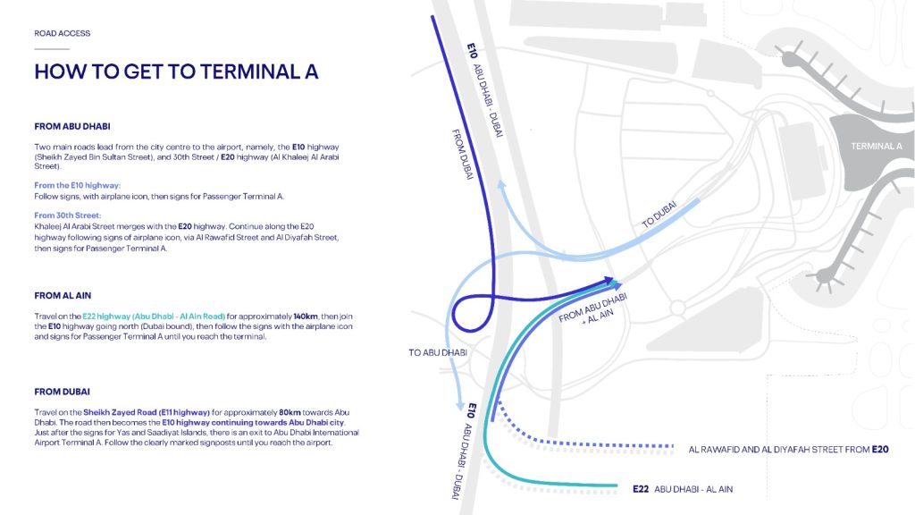 Part of the awareness campaign is also informing the general public of the exact location of the new Terminal, which has recently been added to all the popular way-finding applications, like Google Maps and Waze. Reaching Terminal A by car is a quick and effortless journey from both Abu Dhabi and Dubai, with highway signage now clearly sign posted on the E10 and E11 and in other locations in and around the new terminal. Those taking a taxi or public transport to the new terminal can get dropped off directly at the terminal.