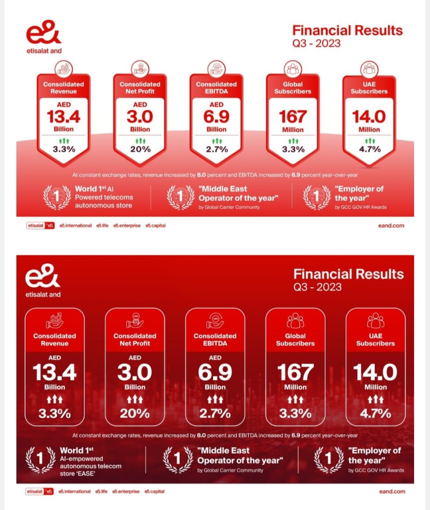 e& today announced its consolidated financial results for Q3 2023 reporting consolidated revenues of AED 13.4 billion with a YoY increase of 3.3 per cent while consolidated net profit was AED 3.0 billion, a year-over-year increase of 20 per cent.