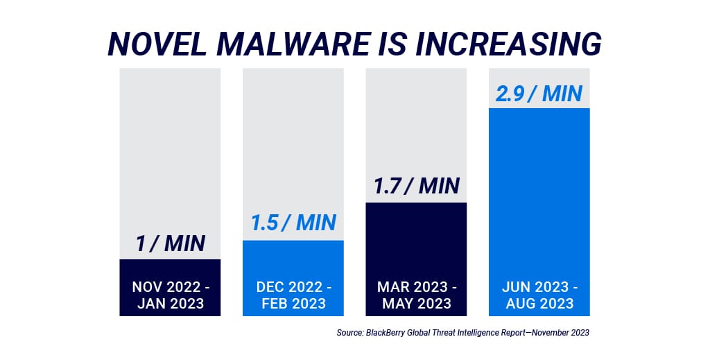 · Continued Rise in Cyberattacks Per Minute. BlackBerry stopped over 3.3 million attacks; approximately 26 attacks and 2.9 unique malware samples per minute.