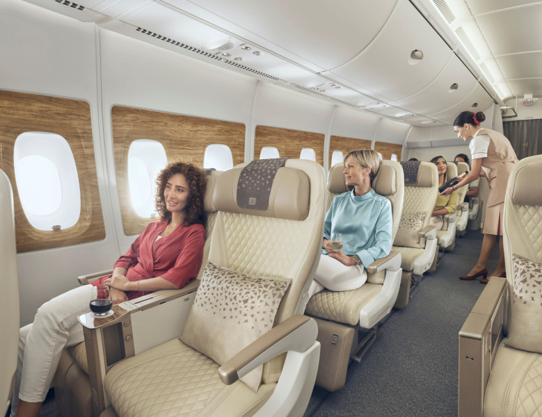 On a four-class Emirates A380, the Premium Economy cabin is located at the front of the main deck with 56 seats laid out in a 2-4-2 configuration. In the cabin, every inch of space anticipates customer needs with a generous seat pitch and width for working and relaxing, and customised features that offer function and convenience like in-seat charging points and a side cocktail table. The experience is rounded off with expertly curated in-flight amenities, an inventive menu, and extensive beverage options. Emirates Premium Economy is deployed on flights EK 261 and EK 262 between Dubai and Brazil.