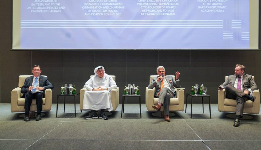 The panel was moderated by Dr. Rickard Galkipro, Associate Professor at Anwar Gargash Diplomatic Academy, in which His Excellency Arthur Matley, Ambassador of Switzerland to the United Arab Emirates and the Kingdom of Bahrain, and Mr. Giuseppe Saba, Executive Director of the World Humanitarian City Dub.