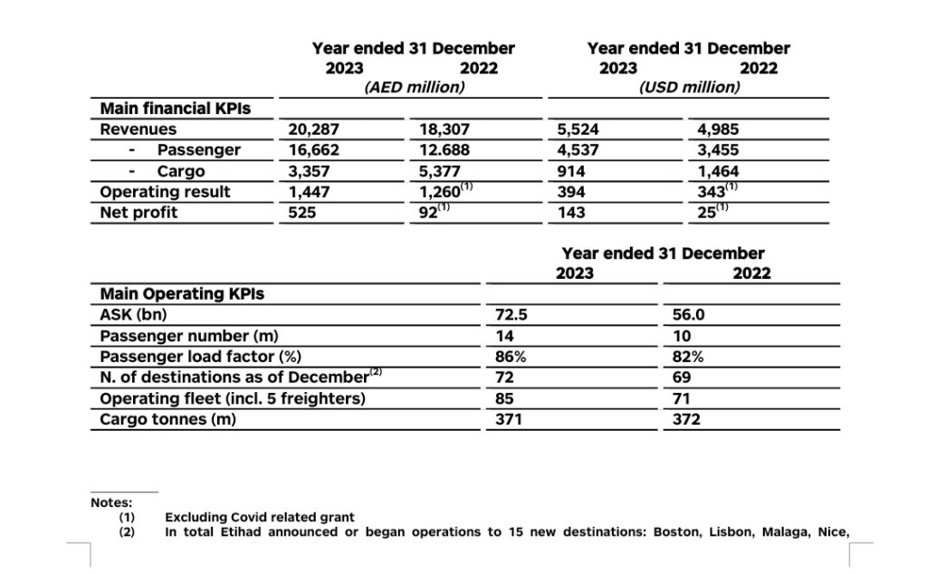 ABU DHABI: Etihad Airways today announced its results for the full year 2023, recording AED 1.4 billion (U.S.$ 394 million) operating result, driven by AED 4 billion (U.S.$ 1.1 billion) year-on-year growth in passenger revenue, while decreasing unit cost excl. fuel by seven per cent, marking a significant improvement in passenger business profitability.